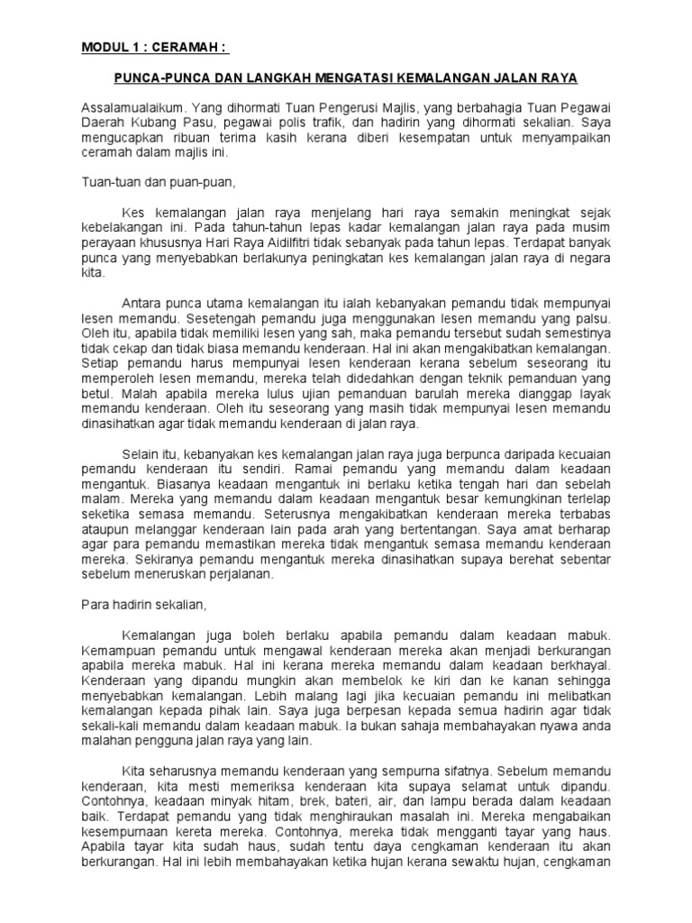 Contoh Karangan Syarahan Brkhemah Di Jalan Raya